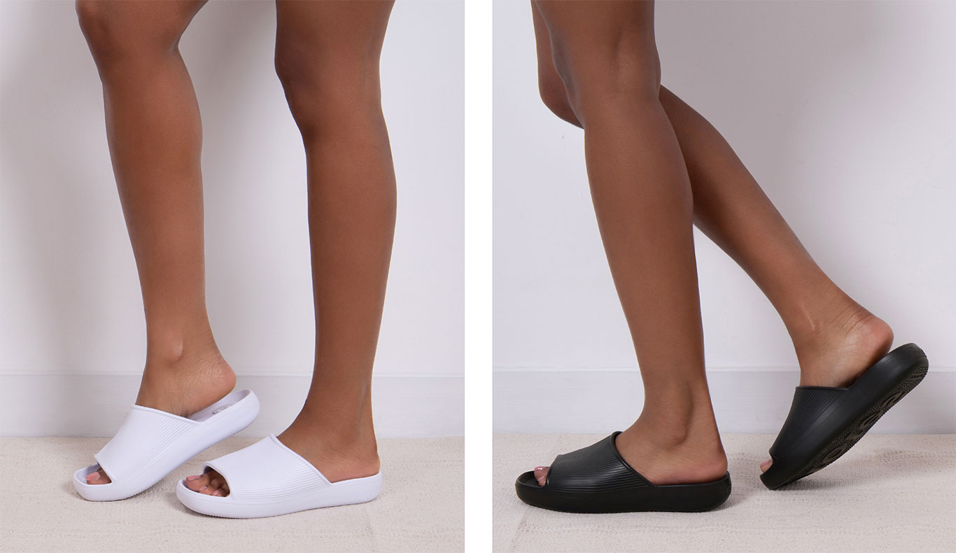 Next up is the Ribbed Slide - a durable, subtly styled slide with a classic ribbed upper - available in both black and white, a stylishly neutral choice to complement any outfit. |