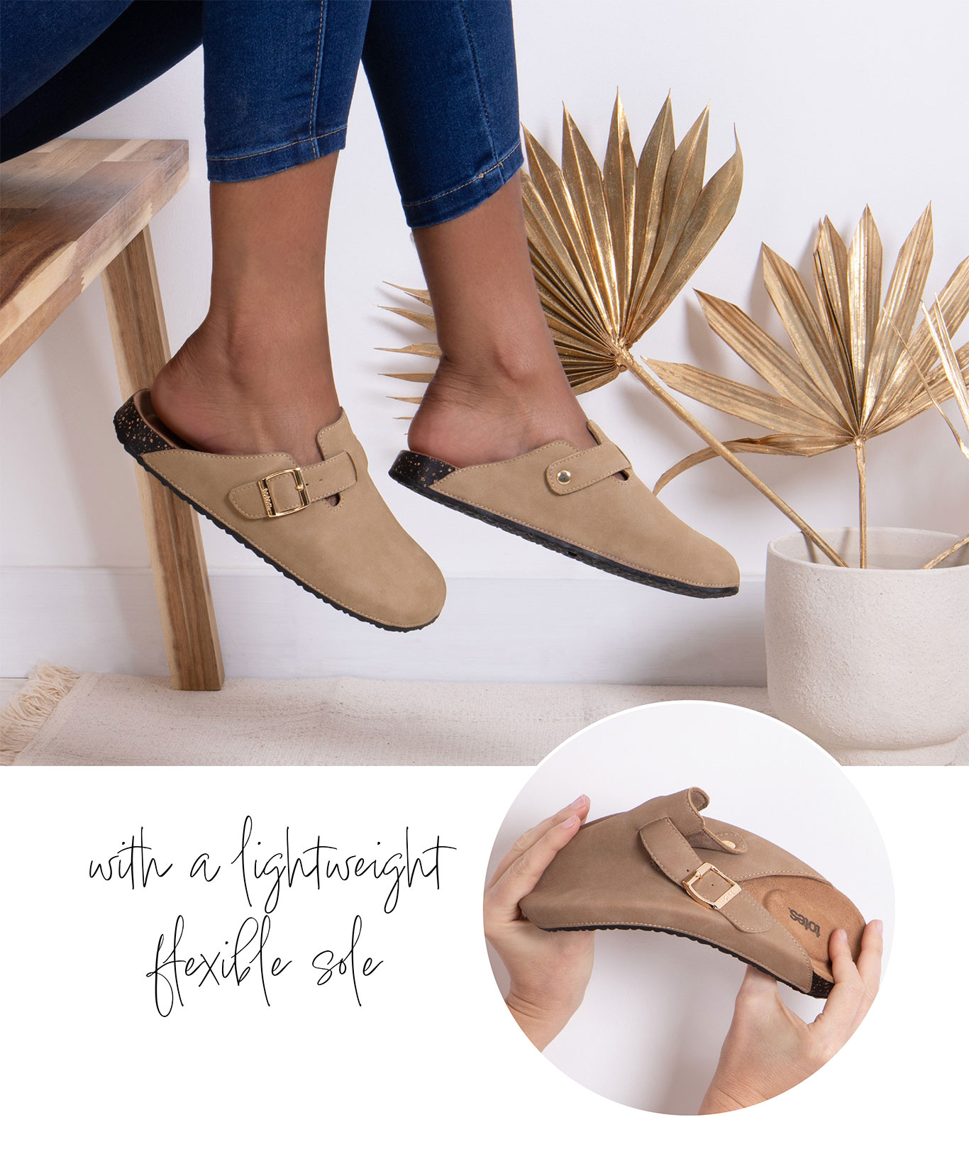 Turn heads in our stunning gold double buckle slider. Its timeless design will elevate any summer outfit and it’s also available in black with contrasting gold buckles. The comfort heel patch and moulded footbed ensure summertime comfort wherever the day may take you. |