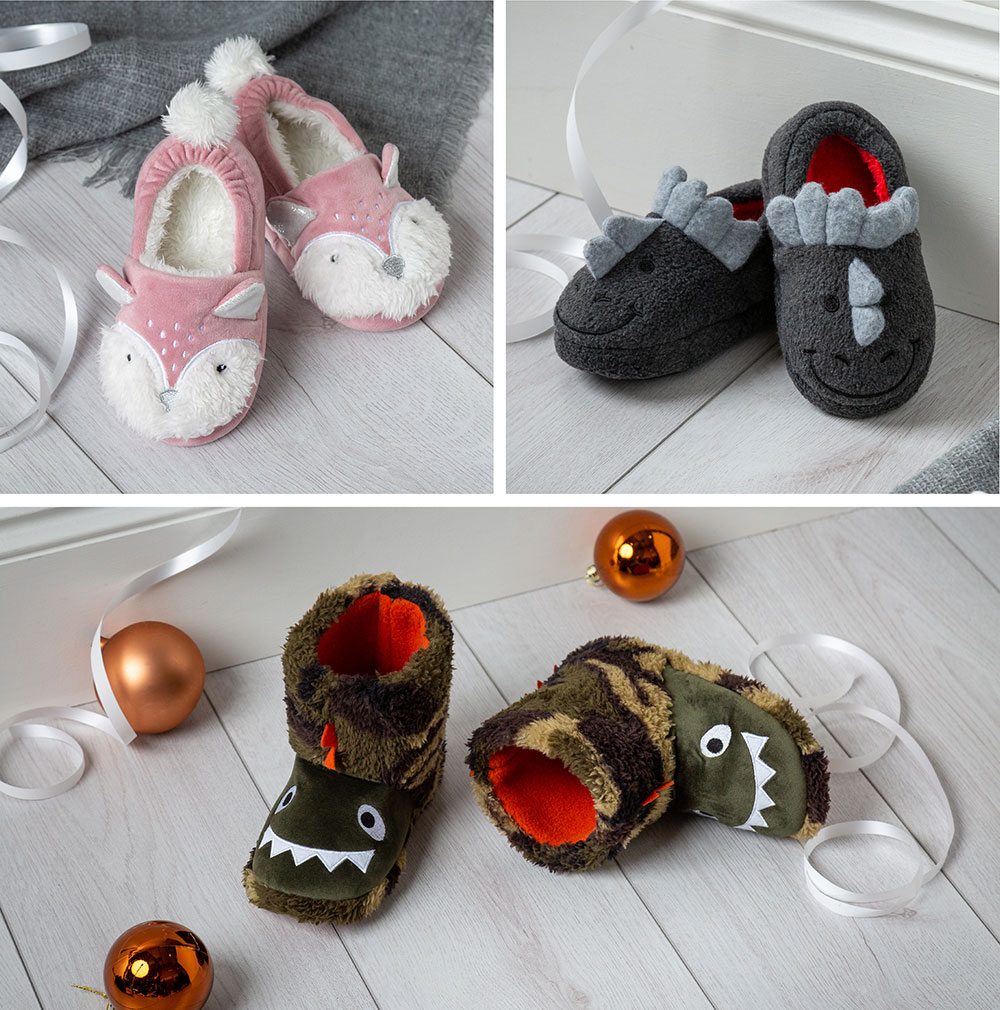 Pop some slippers in their Christmas eve box! Choose from our range of moccasin and booties slippers, in fun, colourful and playful characters. Cats, sharks and dinosaur designs, complete with warm soft linings and slip-resistant treads, perfect for when the excitement has them running about the house to check if Rudolf ate his treats and see what Father Christmas has left for them under the tree, making that one special day in December, a cosy Christmas to remember.