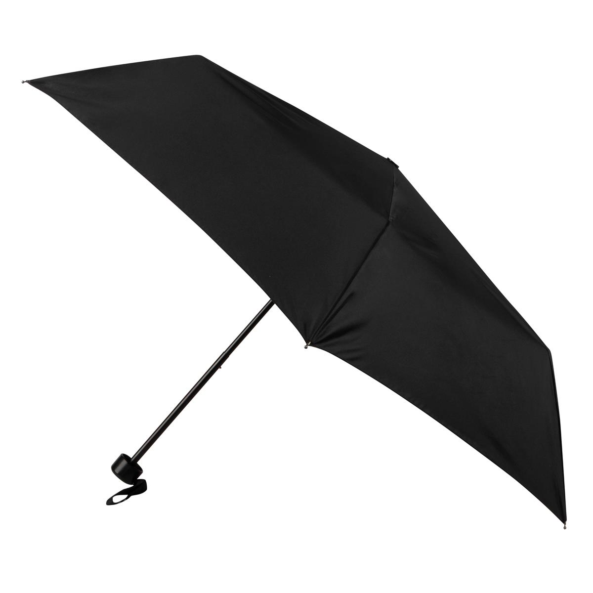 An easy to use, steel-framed flat folding umbrella in classic black. With colour-matched handle, a co-ordinating cover PLUS a 100% recycled fabric canopy, this is a handy wet weather staple every time.