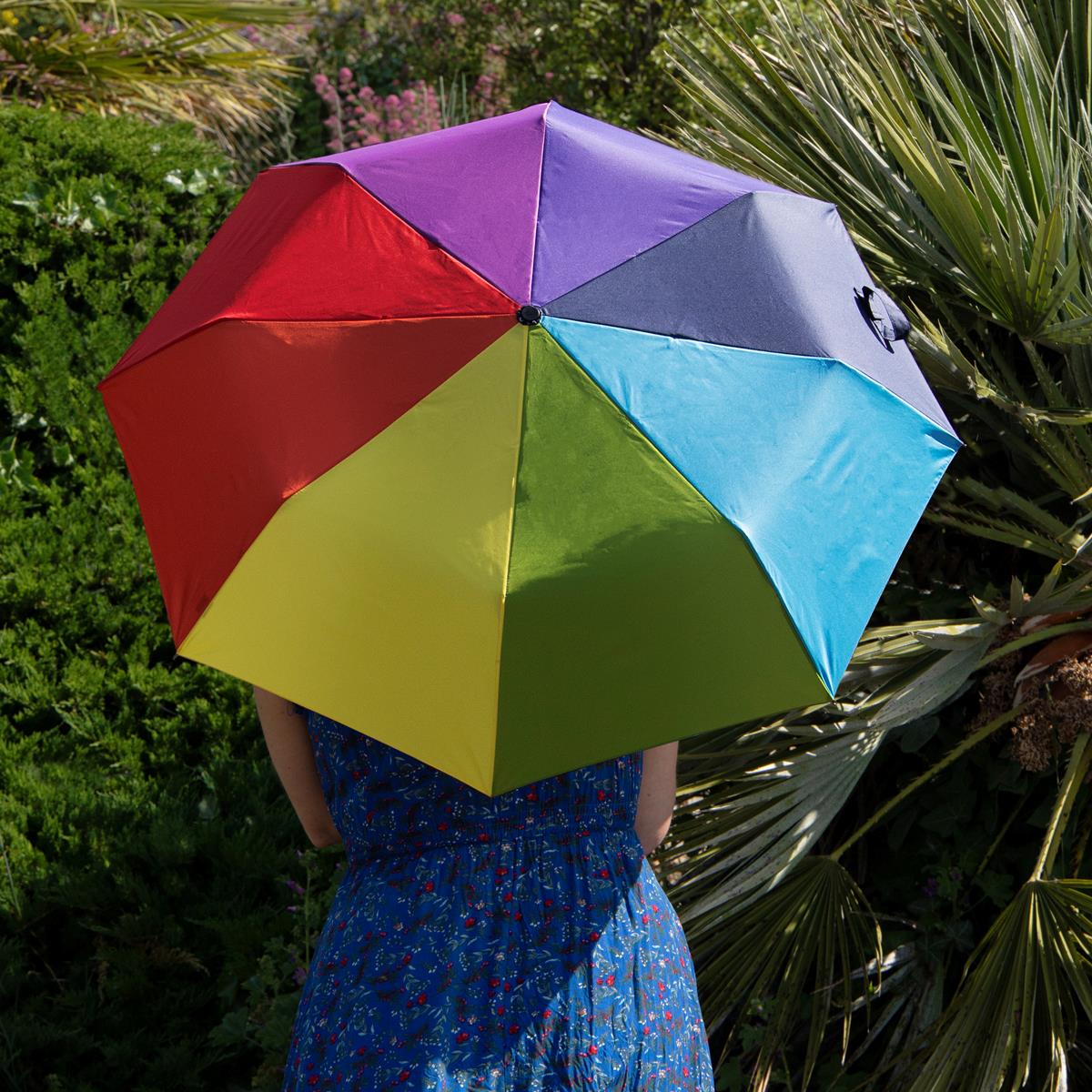 Stay protected and stylish with the totes® UV Supermini Multi Gore Rainbow Print Umbrella! This umbrella features a 100% recycled canopy and a cute multi gore rainbow print. This design does not come with an umbrella case. With a compact foldable design, it's easy to carry, and its Sunguard UPF 50+ protection keeps you safe from harmful UV rays. Lightweight and durable, it’s your perfect companion for rain or shine!