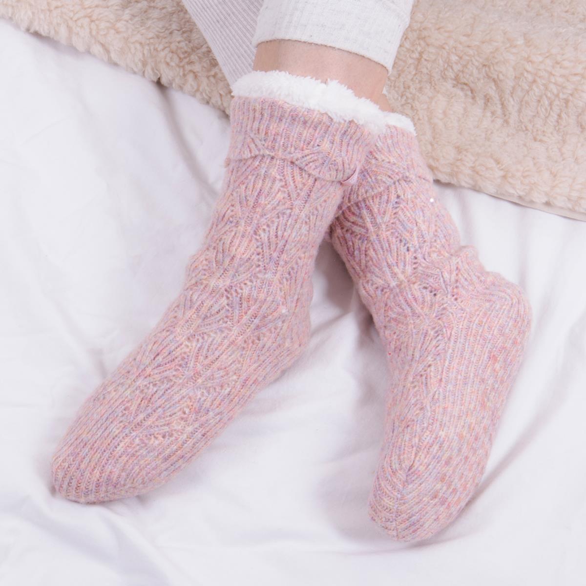 These lovely textured knit slipper socks in a soft pale pink marl offer cosy comfort and seasonal charm. Finished with our famous slip-resistant tread, they're a delightful choice for chilly days.