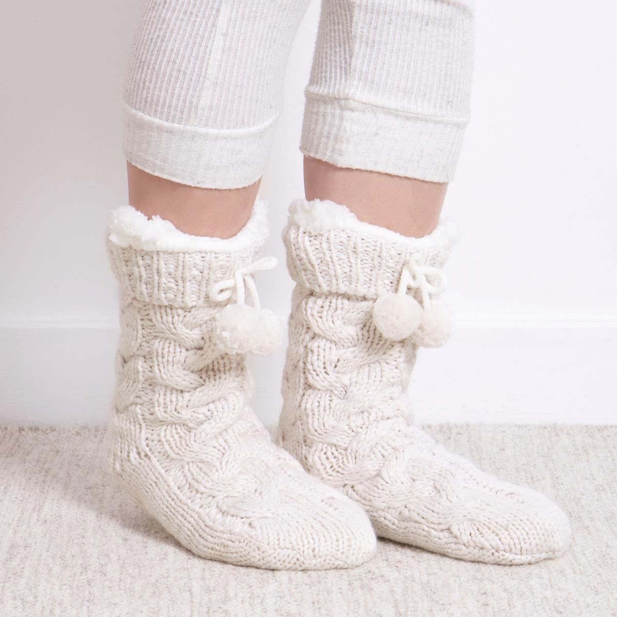 Gorgeous slipper socks with a warm sherpa lining in a cool cream cable knit will keep you cosy all winter long. Fluffy pom poms on a tassel trim and our famous slip-resistant tread add up to a great addition to your winter accessory collection.