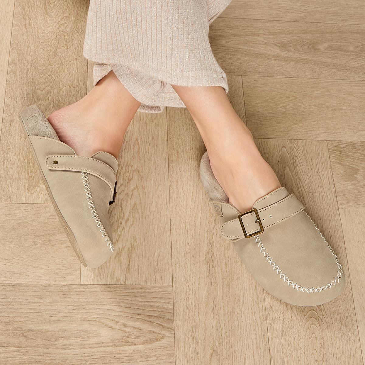 Our fabulous open back moccasin is a stylish option for the season; on a chunky, flat soft sole with a decorative buckle and stitching detail to the vamp, it’s a springtime special for sure! The suedette fabric is soft and comfy and with our Pillowstep® tufted insole plus memory foam for added luxury, you’ll be set for summer and beyond.