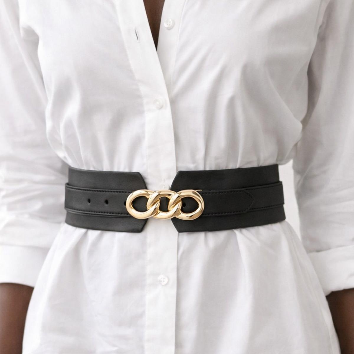 Elevate your look with the totes® Ladies Waist Belt. Boasting a striking gold buckle of three interlocking chain-style links, this belt adds a refined yet edgy accent to any outfit. The sleek black finish and neat stitching create a polished focal point for jeans, skirts, or dresses, designed to define the waist with confidence and style.