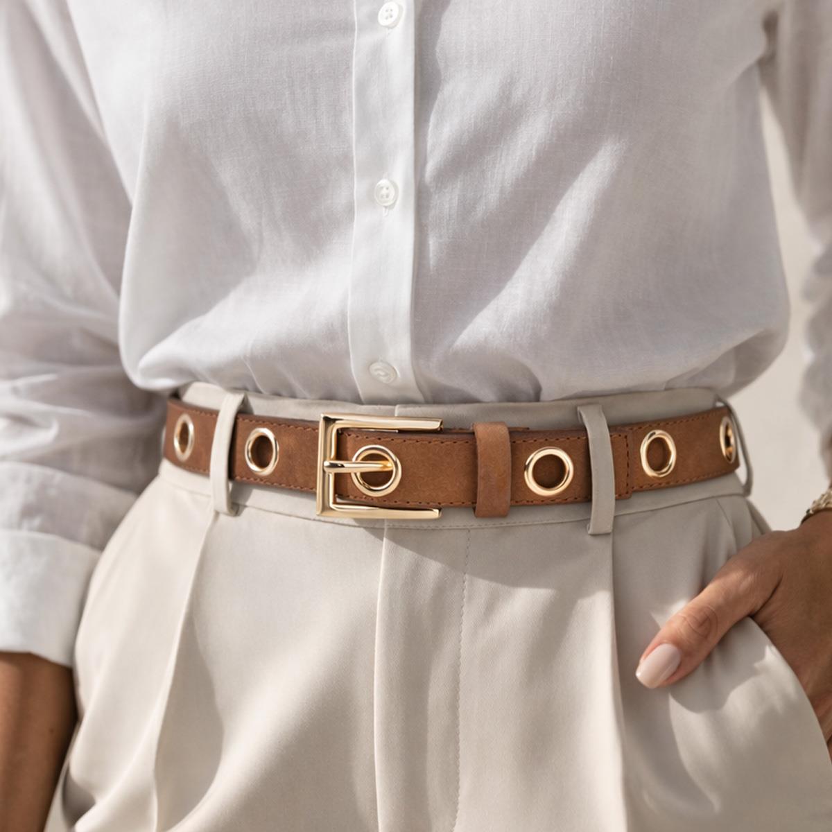 Make your outfit stand out with the totes® Ladies Studded Statement Jean Belt. Featuring bold metal eyelet studs along the length and a sleek metal buckle, this belt adds a fashionable edge to jeans, skirts, or casual dresses. Its adjustable fit ensures comfort while giving your look a striking, stylish finish.